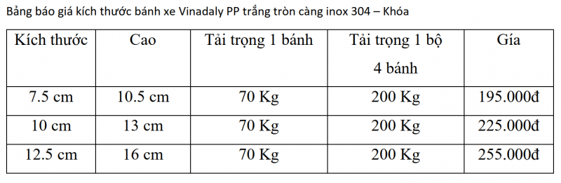 Bảng báo giá & kích thước Bánh xe PP càng inox 304 – Khóa