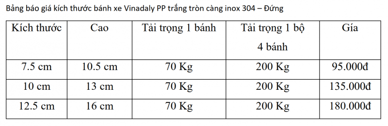 Bảng báo giá & kích thước Bánh xe PP inox 304 – Đứng