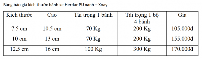 Bảng báo giá & kích thước Bánh PU xanh – Xoay