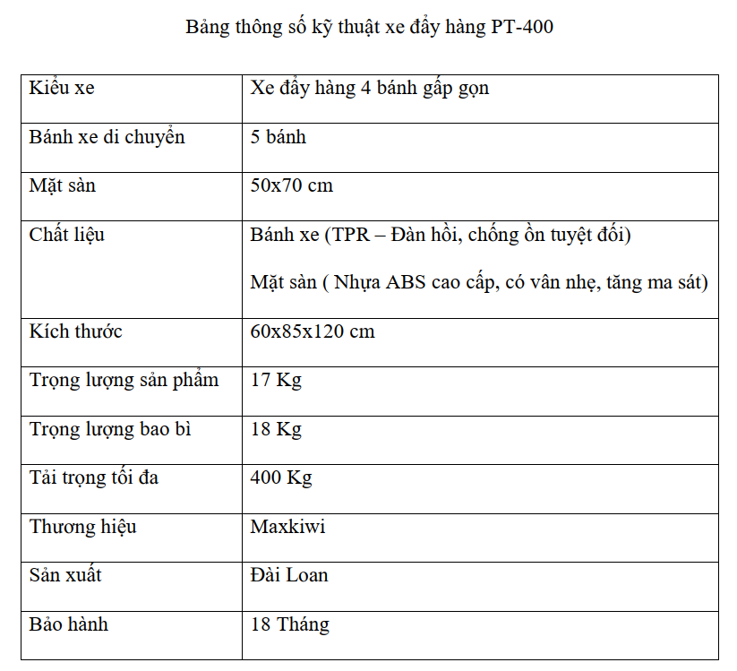 Thông số kỹ thuật xe đẩy hàng PT-400