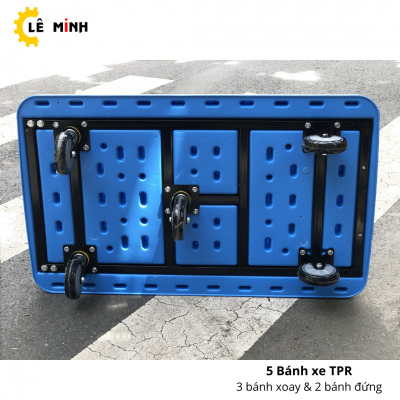 - Được lắp ráp 5 bánh xe(3 bánh xoay & 2 bánh đứng) tăng khả năng chịu lực cho sàn xe.
