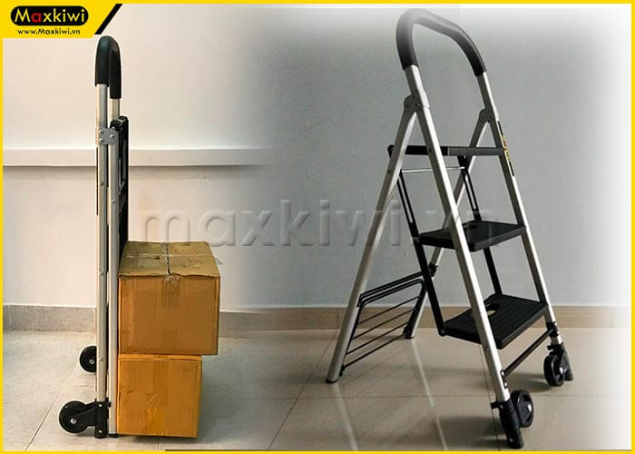 Xe đẩy hàng kết hợp thang xếp có thể linh động biển đổi giữa 2 chức năng: xe đẩy hàng 2 bánh và thang xếp, cho phép người dùng sử dụng cho nhiều nhu cầu khác nhau: dùng để sắp đồ lên kệ, vận chuyển hàng hóa hoặc đem ra ngoài vườn tỉa cây cảnh, sửa bóng đèn…