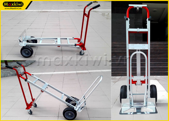 Mẫu xe đẩy này có thể nhanh chóng “biến hình” từ một xe đẩy hàng 2 bánh thành xe đẩy hàng 4 bánh bằng hoặc nghiêng. Với sự tiện ích này sản phẩm rất được các đơn vị vận chuyển ưa chuộng vì có thể linh hoạt để vận chuyển được đa dạng hàng hóa.