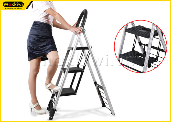 Đặc biệt bậc thang sở hữu kích thước lớn, có bề mặt kẻ vân giúp tăng độ ma sát, an toàn hơn khi sử dụng. Ngoài ra ở phần tay cầm và chân đế đều được bọc cao su, giúp êm ái cũng như hạn chế trơn trượt.